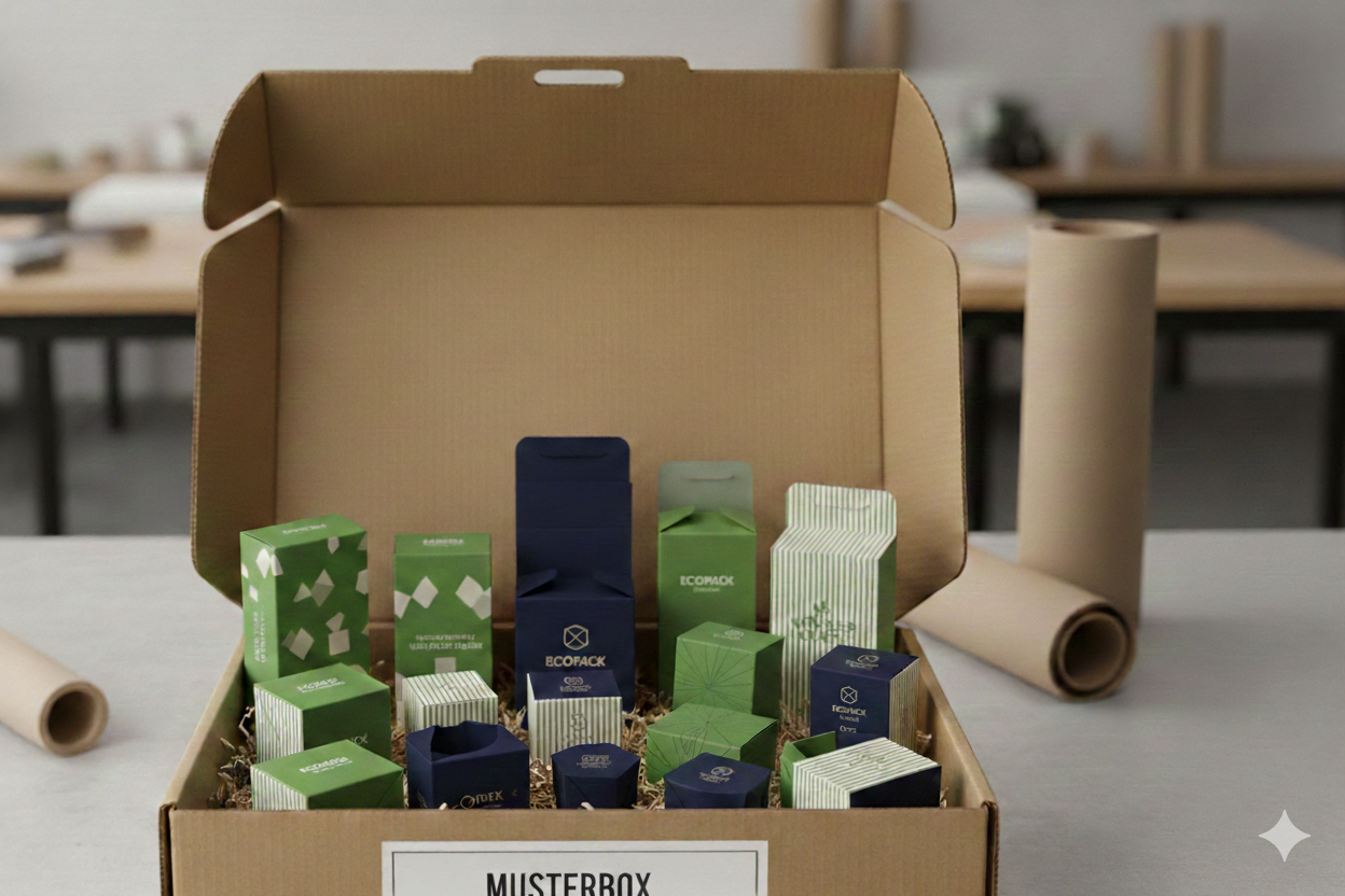 Mit unserer Musterbox erhältst Du einen direkten Einblick in die Welt der Verpackungen. Entdecke verschiedenste Konstruktionen, Kartonsorten sowie Weiterverarbeitungs- und Veredelungsvarianten – kompakt zusammengestellt in einer Box. So kannst Du Materialien, Haptik und Möglichkeiten ganz in Ruhe vergleichen und Dich für Deine eigene Verpackungslösung inspirieren lassen.